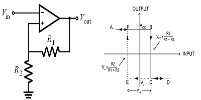 由運(yùn)算放大器構(gòu)建的比較器電路。具有高增益的正反饋環(huán)路可確保一旦輸入電壓高于或低于0 V,輸出就會(huì)在電源軌上飽和